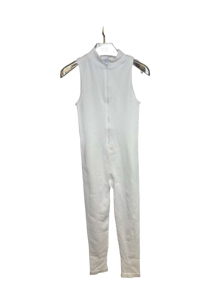 - Fason: Dopasowany kombinezon z prążkowanej dzianiny