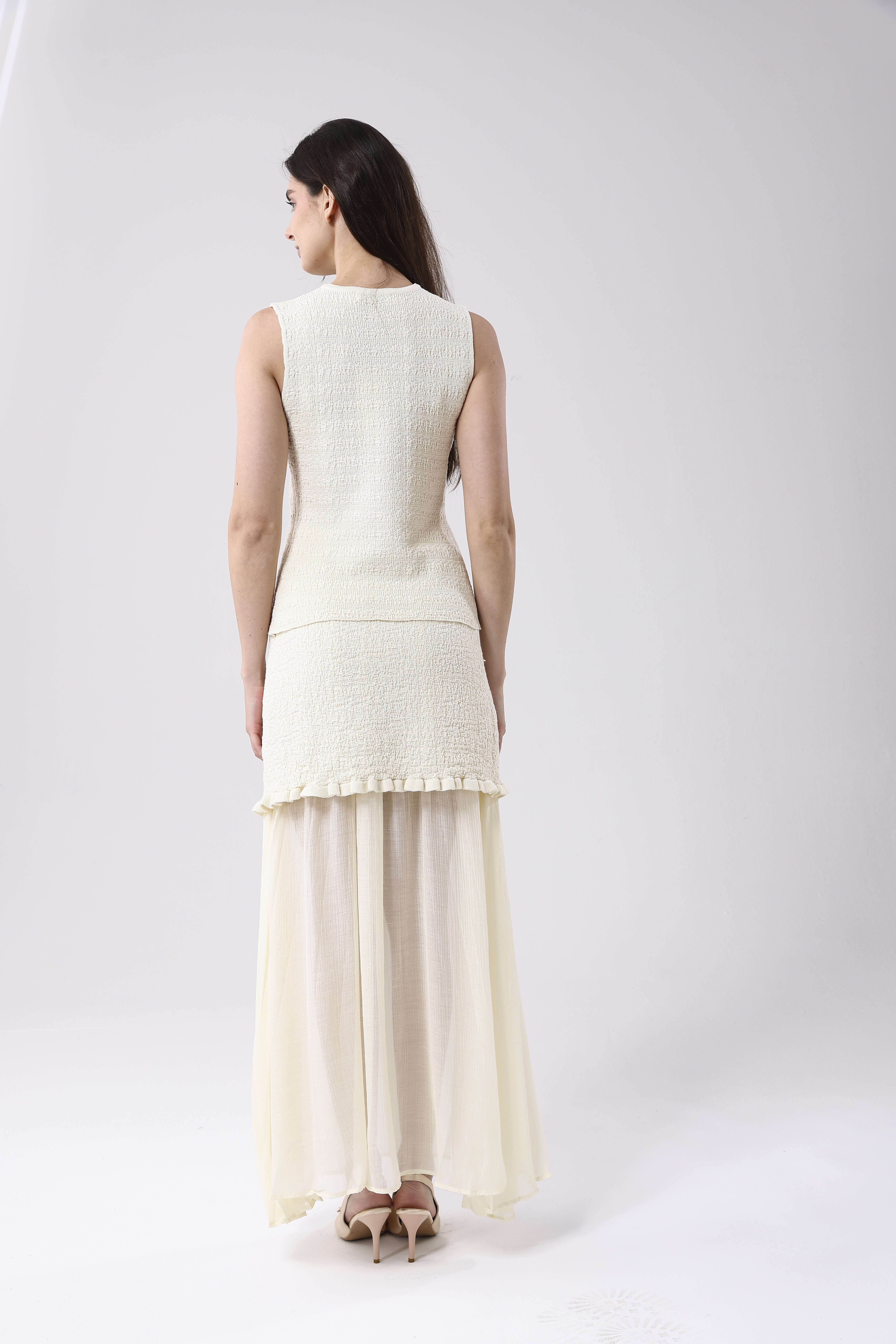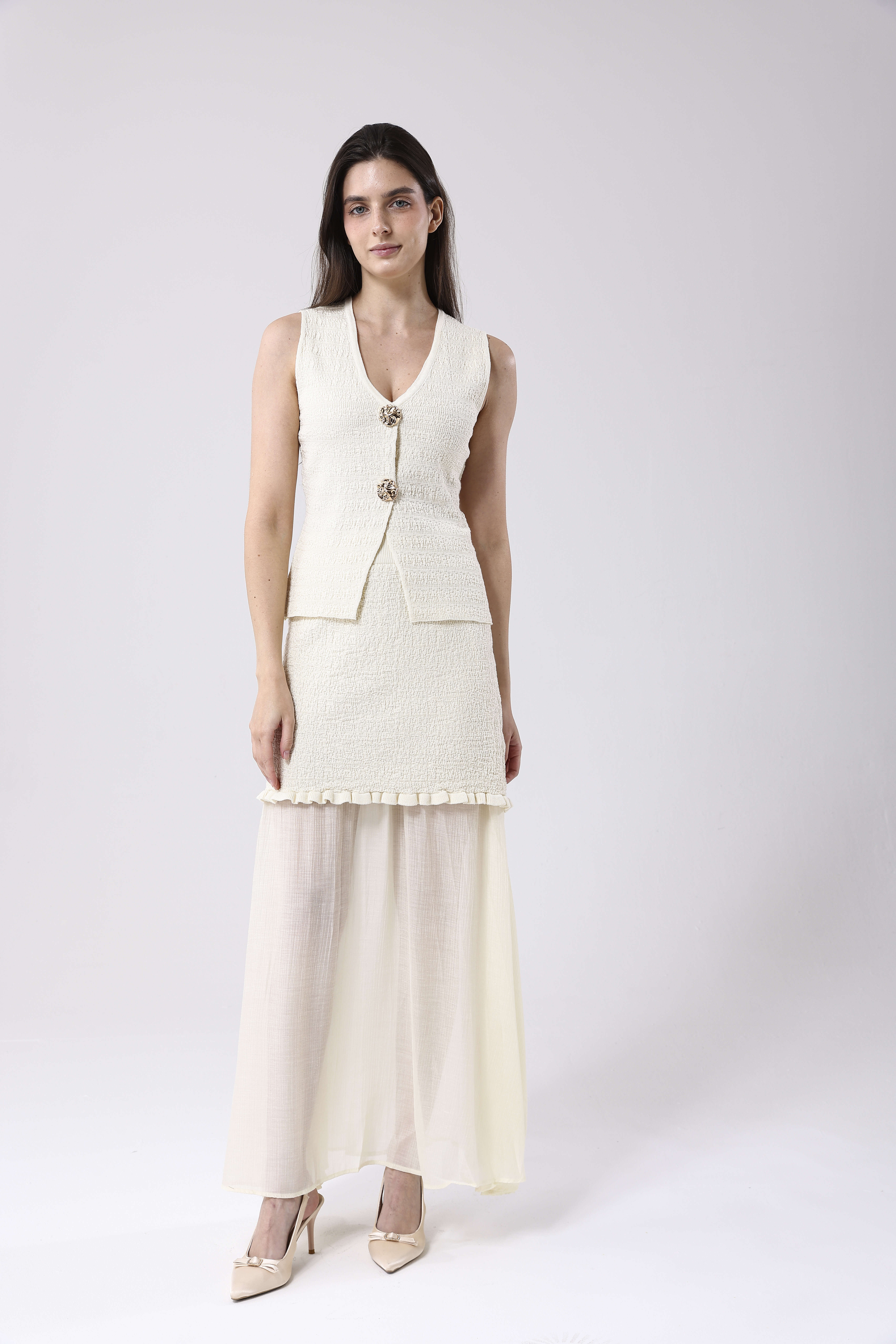 Odkryj kwintesencję wyrafinowanej elegancji w naszym najnowszym projekcie. Prezentujemy Komplet ELA, który harmonijnie łączy w sobie unikalną strukturę dzianiny z lekkością zwiewnego materiału. Ten ekskluzywny zestaw składa się z mistrzowsko skrojonej kamizelki o wyczuwalnym splocie, ozdobionej biżuteryjnymi guzikami w odcieniu złota, oraz dopasowanej spódnicy. Spódnica zachwyca finezyjnym połączeniem gładkiej góry z plisowanym dołem, co nadaje sylwetce niezwykłej dynamiki i gracji przy każdym ruchu.