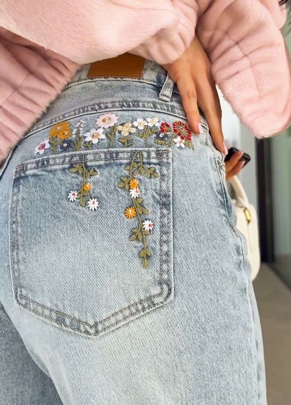 To, co wyróżnia te jeansy, to precyzyjnie wykonany haft z motywem kwiatowym, umieszczony dyskretnie na tylnej kieszeni. Ten florystyczny detal nadaje spodniom wyrazistego charakteru i sprawia, że stają się one wyjątkowym elementem każdej stylizacji. Idealnie komponują się zarówno z prostym t-shirtem i sneakersami na co dzień, jak i z elegancką bluzką oraz butami na obcasie na bardziej formalne wyjścia.