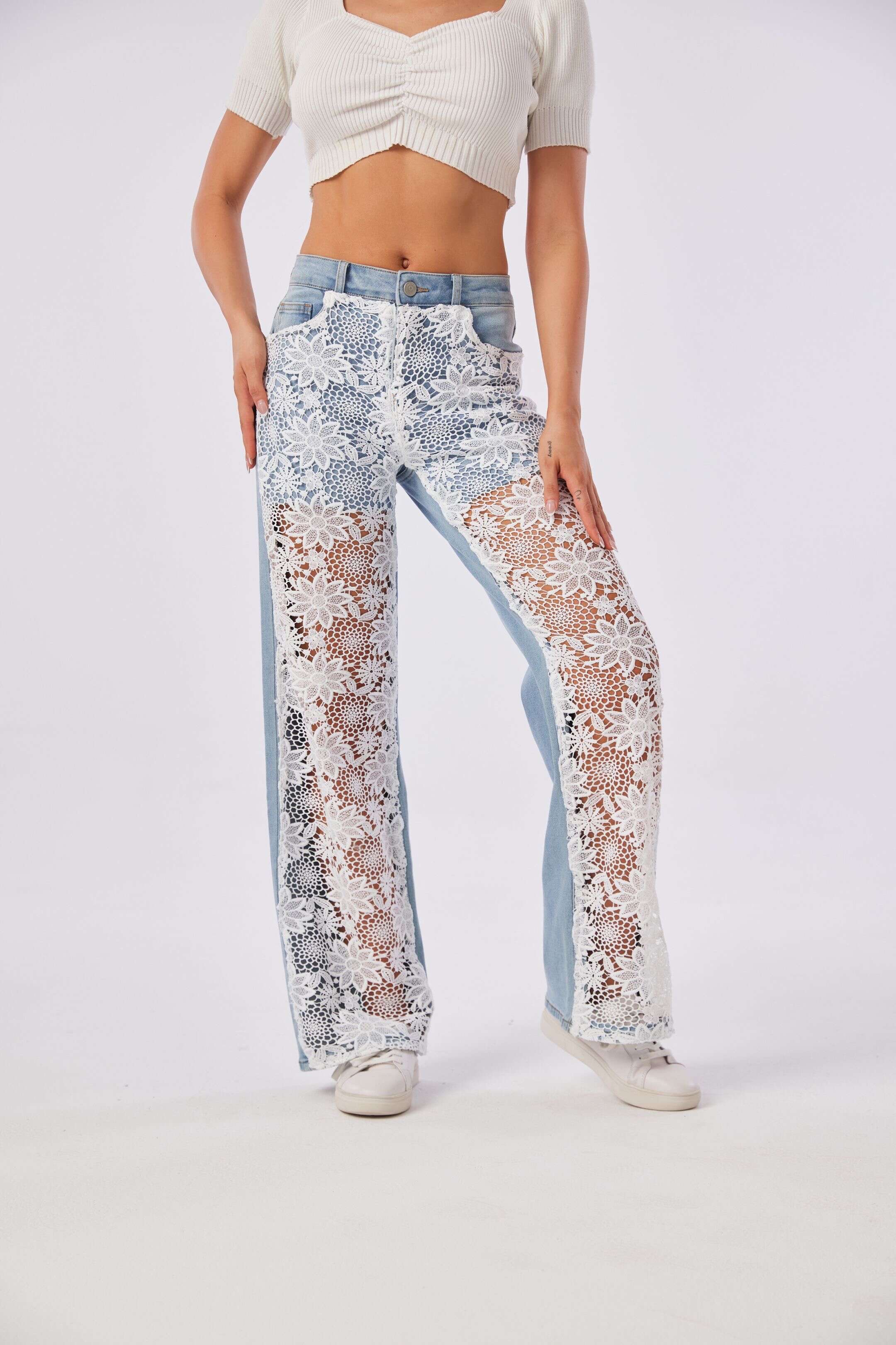 Odkryj niezwykłe połączenie casualowej swobody i wyrafinowanej elegancji ze spodniami OMITEL. Te wyjątkowe jeansy o modnym, szerokim kroju w klasycznym odcieniu denim zachwycają spektakularnymi panelami z misternej, białej koronki. To propozycja dla kobiet, które nie boją się wyróżniać i cenią unikatowe detale, nadające stylizacji lekkości i niepowtarzalnego charakteru.
