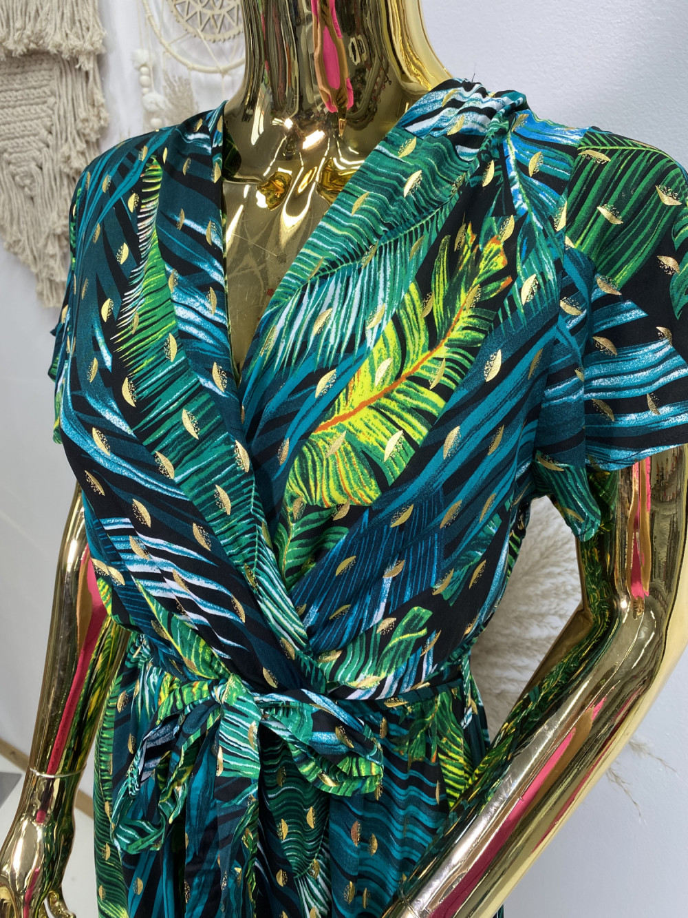Sukienka Miss Sara w kolorze zielonym to doskonała propozycja dla każdej kobiety ceniącej styl i wygodę. Model maxi z lekko rozkloszowanym dołem i wiązaniem w talii doskonale podkreśla sylwetkę, a modne, tropikalne wzory wpisują się w najgorętsze trendy sezonu. Sukienka została wykonana z wysokiej jakości, przewiewnego materiału, który gwarantuje komfort nawet w najcieplejsze dni. Sprawdzi się zarówno na co dzień, wakacyjny spacer, jak i na letnią imprezę. Dostępna w popularnych rozmiarach, idealna do hurtowej sprzedaży – must-have w letniej kolekcji Twojego sklepu!